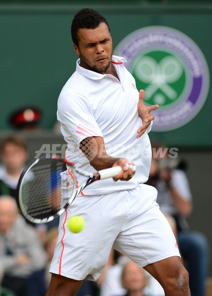 リターンを打つジョーウィルフリード・ツォンガ(2012年7月6日撮影)。(c)AFP/LEON NEAL