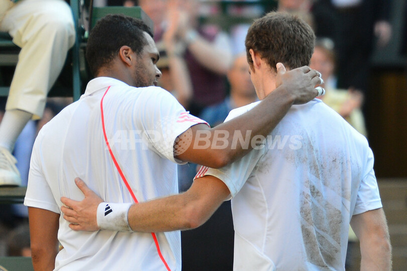 試合後に健闘を称えあうジョーウィルフリード・ツォンガとアンディ・マレー(2012年7月6日撮影)。(c)AFP/LEON NEAL