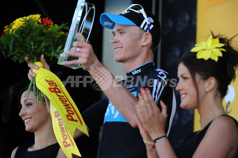 ステージ優勝を飾り、表彰式に臨むチームスカイのクリス・フルーム(2012年7月7日撮影)。(c)AFP/PASCAL PAVANI