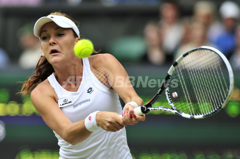 リターンを打つアニエスカ・ラドワンスカ(2012年7月7日撮影)。(c)AFP/GLYN KIRK