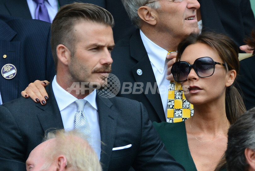 試合観戦に訪れたデビッド・ベッカム( David Beckham、右)とヴィクトリア・ベッカム(Victoria Beckham)夫妻(2012年7月8日撮影)。(c)AFP/LEON NEAL