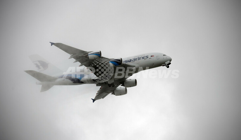 写真は、デモ飛行するマレーシア航空(Malaysian Airlines)の超大型旅客機エアバス(Airbus)「A380」(2012年7月9日撮影)。(c)AFP/ADRIAN DENNIS