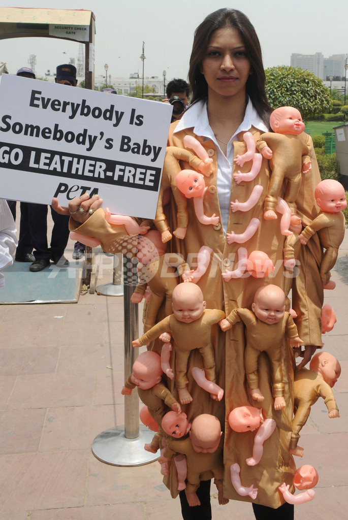 【7月10日 AFP】インドのニューデリー(New Delhi)で開かれた国際レザーフェア(India International Leather Fair)で5日、国際動物愛護団体「動物の倫理的扱いを求める人々の会(PETA)」のメンバーが赤ちゃんの人形をバラバラにして衣服に縫いつけた衣装で、皮革製品に抗議した。