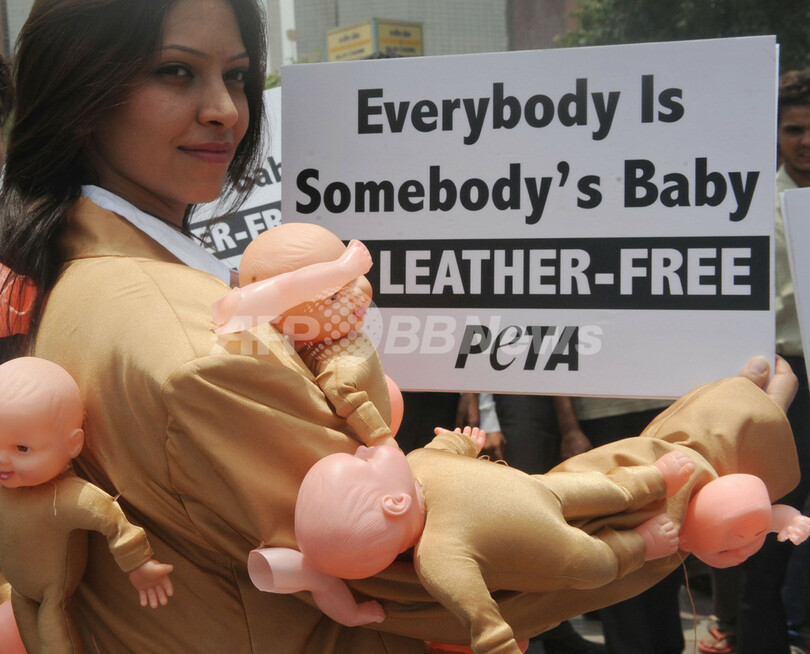 【7月10日 AFP】インドのニューデリー(New Delhi)で開かれた国際レザーフェア(India International Leather Fair)で5日、国際動物愛護団体「動物の倫理的扱いを求める人々の会(PETA)」のメンバーが赤ちゃんの人形をバラバラにして衣服に縫いつけた衣装で、皮革製品に抗議した。
