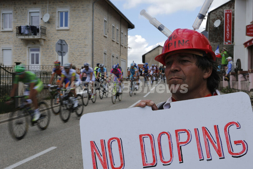 沿道で反ドーピングのプラカードを掲げるファン(2012年7月11日撮影)。(c)AFP/JOEL SAGET