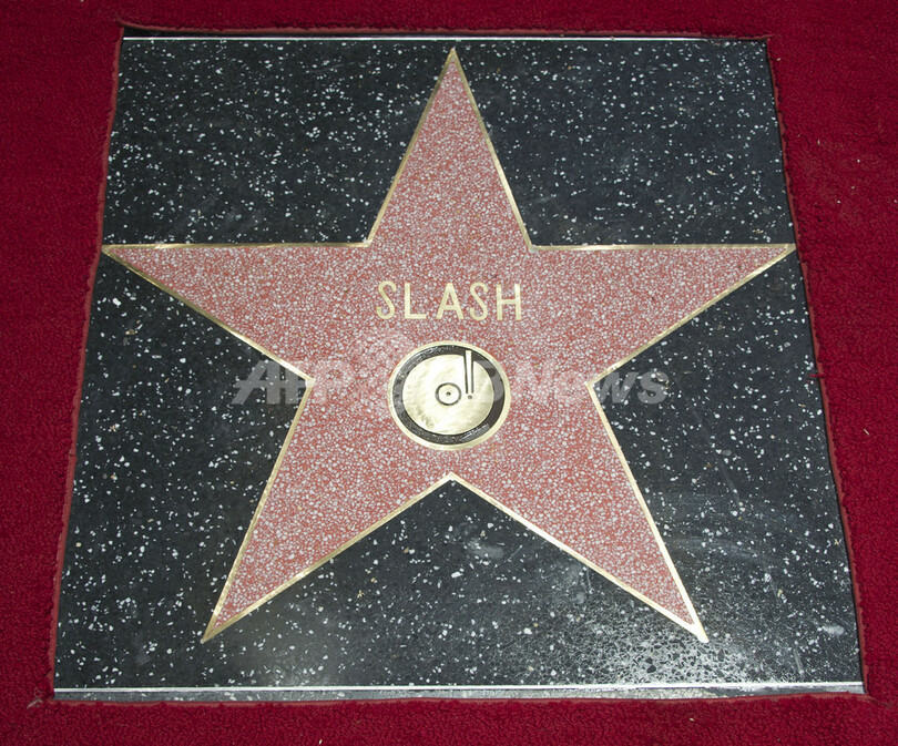 写真は、ハリウッド・ウォーク・オブ・フェームに埋め込まれたスラッシュの星形プレート(2012年7月10日撮影)。(c)AFP/JOE KLAMAR