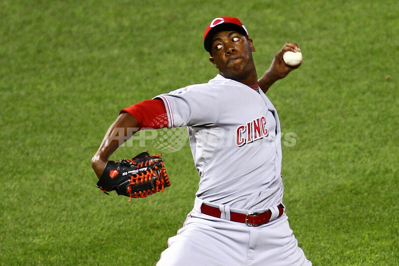 8回に登板し、0回3分の1を投げ無安打無失点に抑えたナ・リーグのアロルディス・ チャップマン(Aroldis Chapman、2012年7月10日撮影)。(c)AFP/Getty Images/Dilip Vishwanat