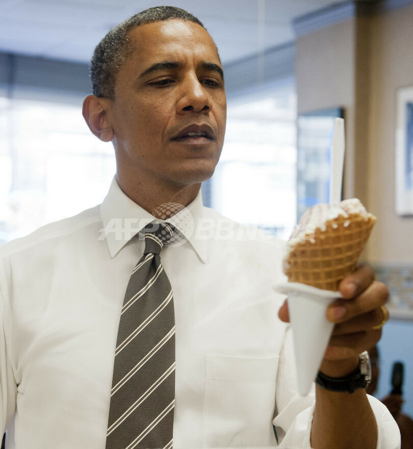 11月の米大統領選で再選を目指すバラク・オバマ(Barack Obama)米大統領は10日、米アイオワ(Iowa)州シーダーラピッズ(Cedar Rapids)のアイスクリーム店を突然訪れ、アイスクリームを注文した。写真はアイスを手に持つオバマ大統領(2012年7月10日撮影)。(c)AFP/Saul LOEB