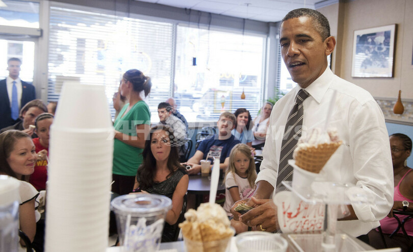 11月の米大統領選で再選を目指すバラク・オバマ(Barack Obama)米大統領は10日、米アイオワ(Iowa)州シーダーラピッズ(Cedar Rapids)のアイスクリーム店を突然訪れ、アイスクリームを注文した。写真はアイスを注文するオバマ大統領(2012年7月10日撮影)。(c)AFP/Saul LOEB