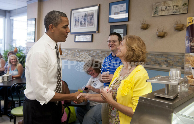 11月の米大統領選で再選を目指すバラク・オバマ(Barack Obama)米大統領は10日、米アイオワ(Iowa)州シーダーラピッズ(Cedar Rapids)のアイスクリーム店を突然訪れ、アイスクリームを注文した。写真はアイス店の来店客にあいさつするオバマ大統領(2012年7月10日撮影)。(c)AFP/Saul LOEB