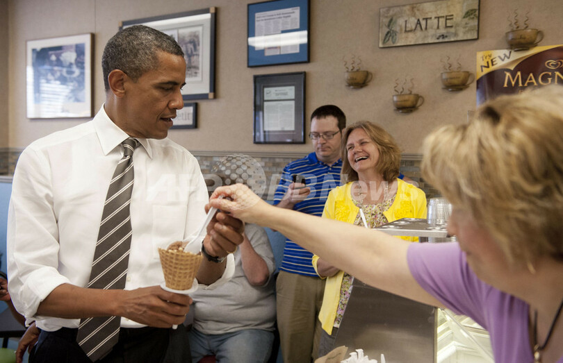 11月の米大統領選で再選を目指すバラク・オバマ(Barack Obama)米大統領は10日、米アイオワ(Iowa)州シーダーラピッズ(Cedar Rapids)のアイスクリーム店を突然訪れ、アイスクリームを注文した。写真はアイスの注文をするオバマ大統領(2012年7月10日撮影)。(c)AFP/Saul LOEB