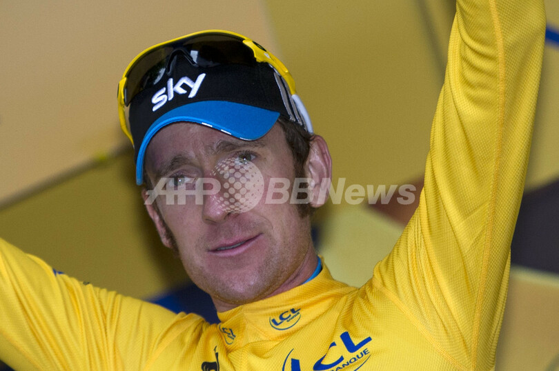 総合首位(マイヨ・ジョーヌ)を守り、表彰式に臨むスカイ(Sky Pro Cycling)のブラッドリー・ウィギンス(Bradley Wiggins、2012年7月16日撮影)。(c)AFP/LIONEL BONAVENTURE