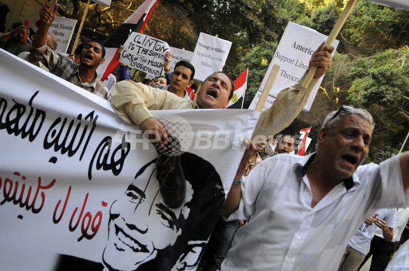 15日の抗議運動は、エジプトで前月行われた大統領選挙で勝利したムスリム同胞団(Muslim Brotherhood)が米国の援助を受けていたとする疑惑に基づくとみられる。クリントン長官は式典で、「エジプト大統領選の勝敗に米国は何ら関与していないことをはっきりさせておきたい。たとえ干渉できたとしても、するつもりはない」と疑惑を否定した。(c)AFP