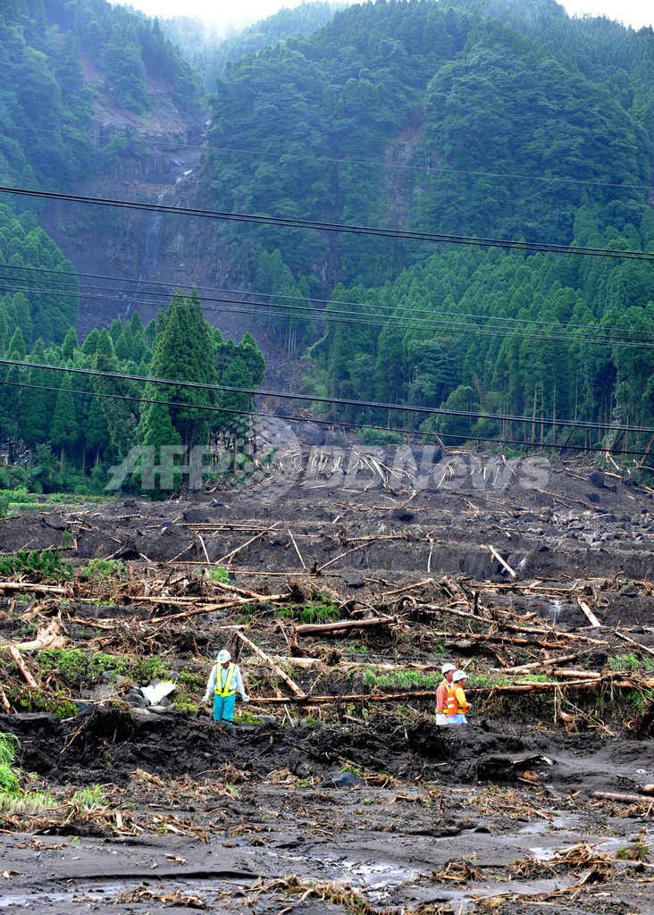 写真は阿蘇市の土砂崩れ現場付近を歩く作業員ら(2012年7月17日撮影)。(c)AFP/KAZUHIRO NOGI