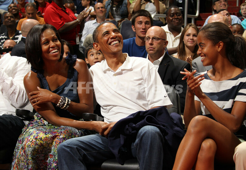 家族とともに観戦に訪れたバラク・オバマ(Barack Obama)米大統領(中央、2012年7月16日撮影)。(c)AFP/Getty Images/NBAE/Ned Dishman