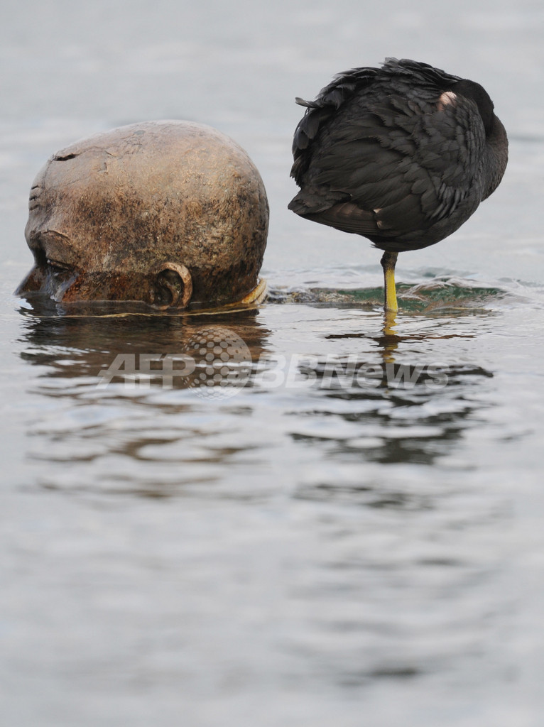 普段は彫刻で水鳥が休息を取る姿を見かけることができるが、ここ数週間の降雨により湖の水位が上昇したため、水鳥は水面下に沈んだ彫刻にかろうじて足を乗せて羽を休めている。(c)AFP