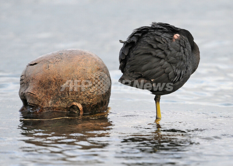 普段は彫刻で水鳥が休息を取る姿を見かけることができるが、ここ数週間の降雨により湖の水位が上昇したため、水鳥は水面下に沈んだ彫刻にかろうじて足を乗せて羽を休めている。(c)AFP