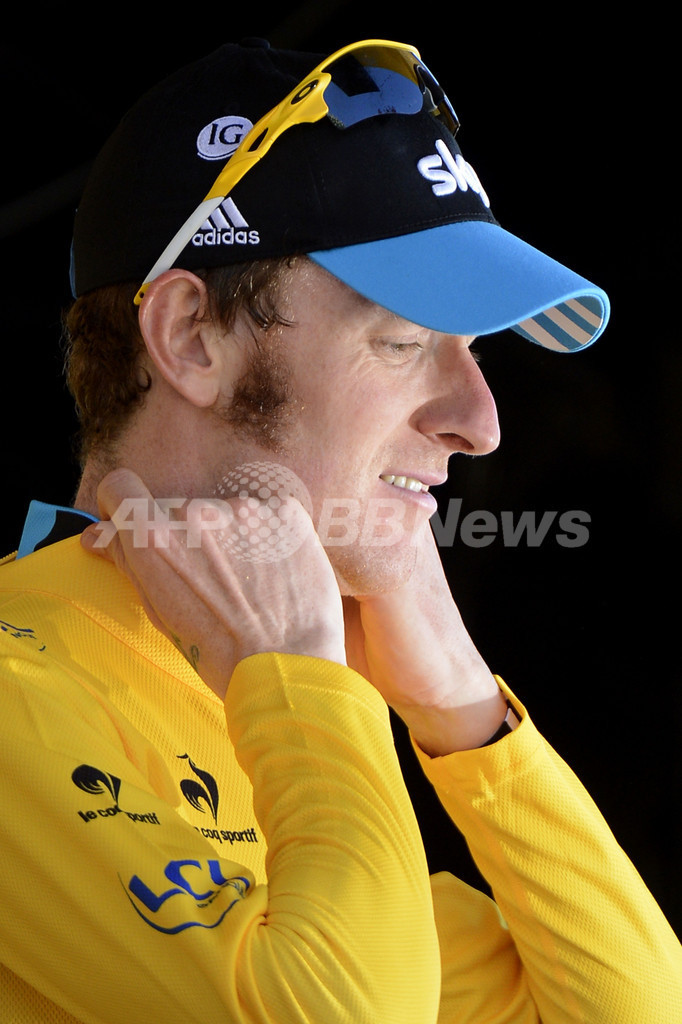 総合首位(マイヨ・ジョーヌ)を守り、表彰式に臨むスカイ(Sky Pro Cycling)のブラッドリー・ウィギンス(Bradley Wiggins、2012年7月18日撮影)。(c)AFP/LIONEL BONAVENTURE
