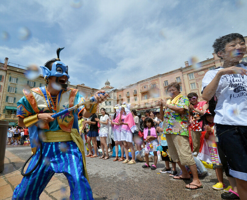【7月18日 AFP】連日30度を超える真夏日が続くなか、千葉県浦安市の東京ディズニーシー(Tokyo Disney Sea)で、南の島をイメージした夏向けウォータープログラム、サマーオアシス・スプラッシュ(Summer Oasis Splash)が始まった。(c)AFP