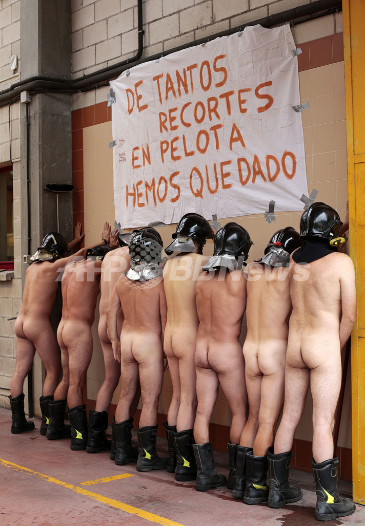 【7月20日 AFP】スペイン北部アストゥリアス(Asturias)自治州ミエレス(Mieres)の消防士たちが19日、「大型削減、我々は丸裸」と書いた横断幕と共に、全裸になって政府の緊縮財政策に抗議した。