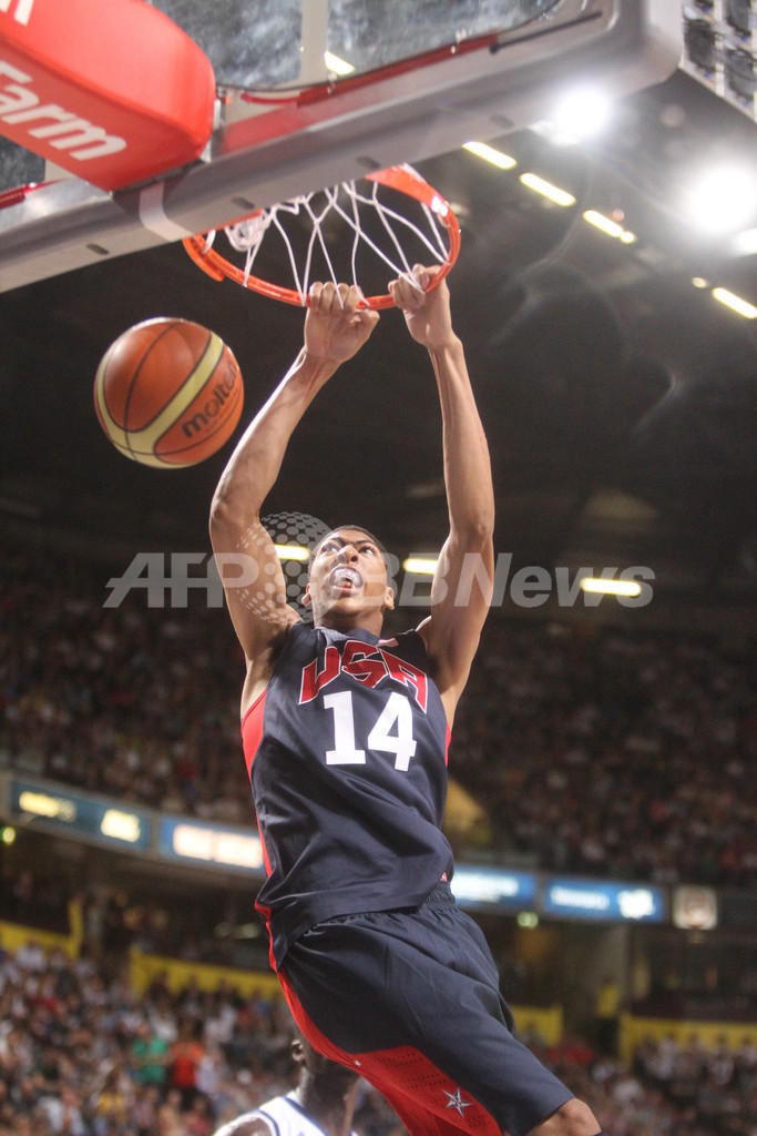 ダンクシュートを決める米国のアンソニー・デイビス(Anthony Davis)2012年7月19日撮影)。(c)AFP/Getty Images/NBAE/Nathaniel S. Butler