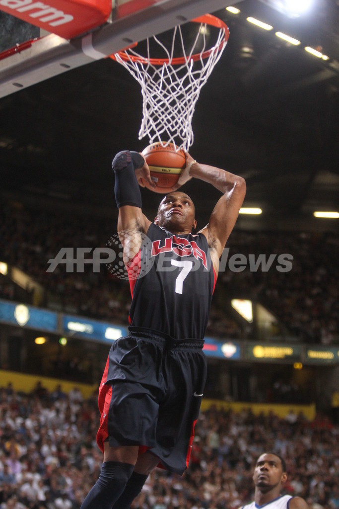 ダンクシュートを狙う米国のラッセル・ウエストブルック(Russell Westbrook、2012年7月19日撮影)。(c)AFP/Getty Images/NBAE/Nathaniel S. Butler
