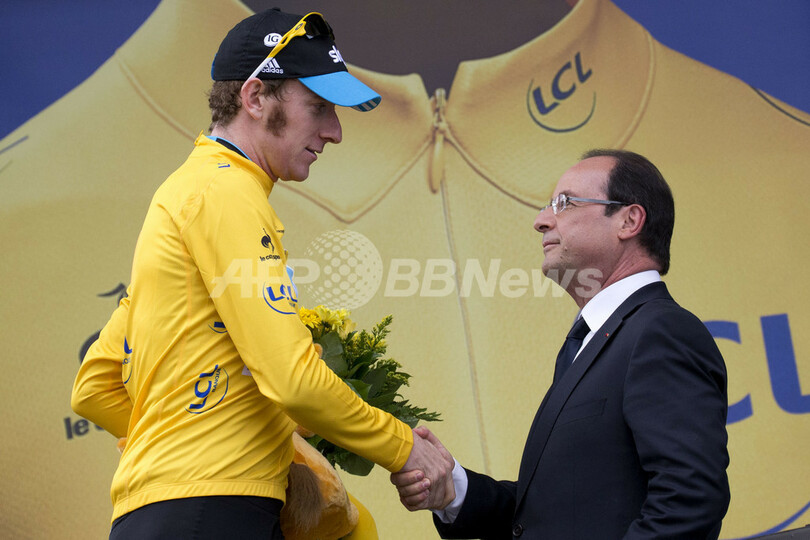 総合首位(マイヨ・ジョーヌ)を守り、表彰式でフランソワ・オランド(Francois Hollande)仏大統領と握手を交わすスカイのブラッドリー・ウィギンス(Bradley Wiggins、2012年7月21日撮影)。(c)AFP/JOEL SAGET
