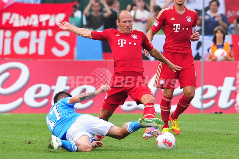 ナポリのマレク・ハムシク(Marek Hamsik)のスライディングタックルを受けるバイエルン・ミュンヘンのアリエン・ロッベン(Arjen Robben、2012年7月20日撮影)。(c)AFP/GIUSEPPE CACACE