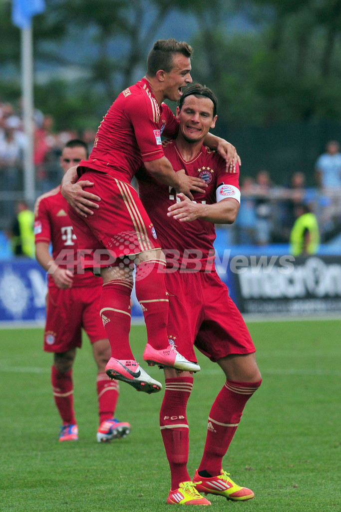 後半29分に同点ゴールを決めて歓喜するバイエルン・ミュンヘンのシェルダン・シャキリ(Xherdan Shaqiri、2012年7月20日撮影)。(c)AFP/GIUSEPPE CACACE