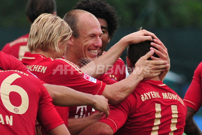 後半29分に同点ゴールを決めたシェルダン・シャキリ(Xherdan Shaqiri)を祝福するバイエルン・ミュンヘンのアリエン・ロッベン(Arjen Robben、2012年7月20日撮影)。(c)AFP/GIUSEPPE CACACE