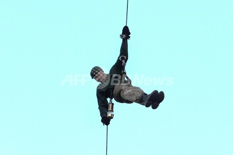 聖火の灯されたランタンを手に、ヘリコプターから降下する英海兵隊員マーティン・ウィリアムス(Martyn Williams、2012年7月20日撮影)。(c)AFP/CARL COURT