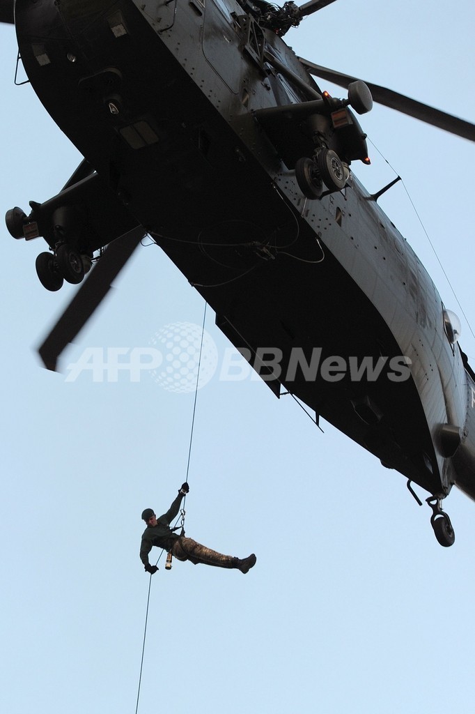 聖火の灯されたランタンを手に、ヘリコプターから降下する英海兵隊員マーティン・ウィリアムス(Martyn Williams、2012年7月20日撮影)。(c)AFP/CARL COURT