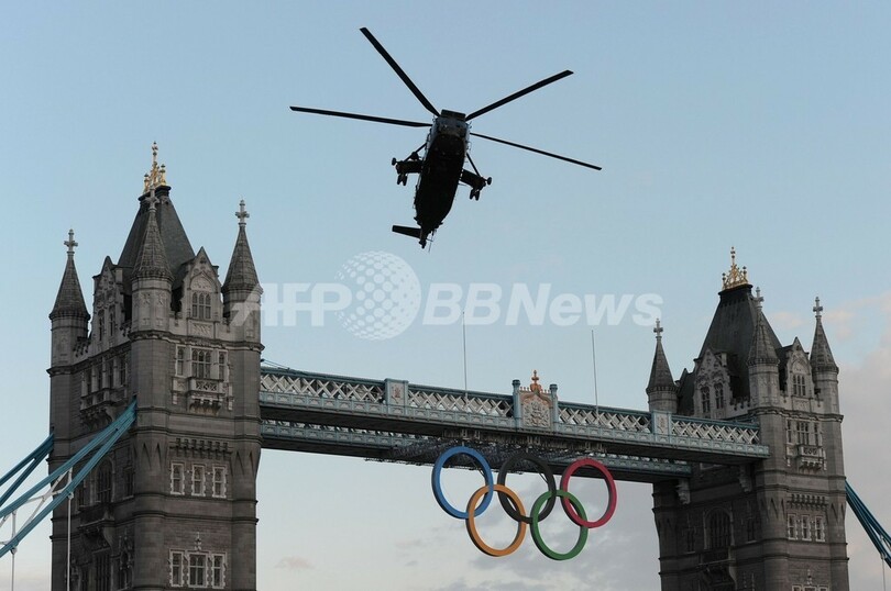 タワーブリッジ(Tower Bridge)の上空を飛ぶ、聖火を運搬する英海軍のヘリコプター(2012年7月20日撮影)。(c)AFP/CARL COURT