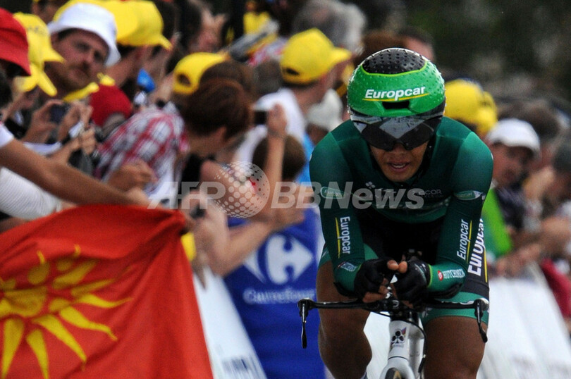 第19ステージの個人タイムトライアルに臨むチーム・ユーロップカー(Team Europcar)の新城幸也(Yukiya Arashiro、2012年7月21日撮影)。(c)AFP/PASCAL PAVANI
