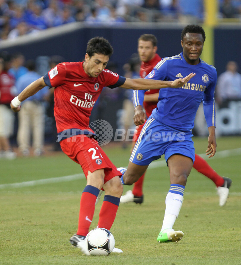 チェルシーのジョン・オビ・ミケル(John Obi Mikel)のチェックを受けるパリ・サンジェルマンのハビエル・パストレ(Javier Pastore、2012年7月22日撮影)。(c)AFP/Mehdi Taamallah