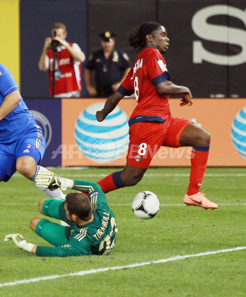 チェルシーのGKロス・ターンブル(Ross Turnbull)に得点機を阻まれるパリ・サンジェルマンのペギー・ルインドゥラ(Peguy Luyindula、2012年7月22日撮影)。(c)AFP/Getty Images/Andy Marlin