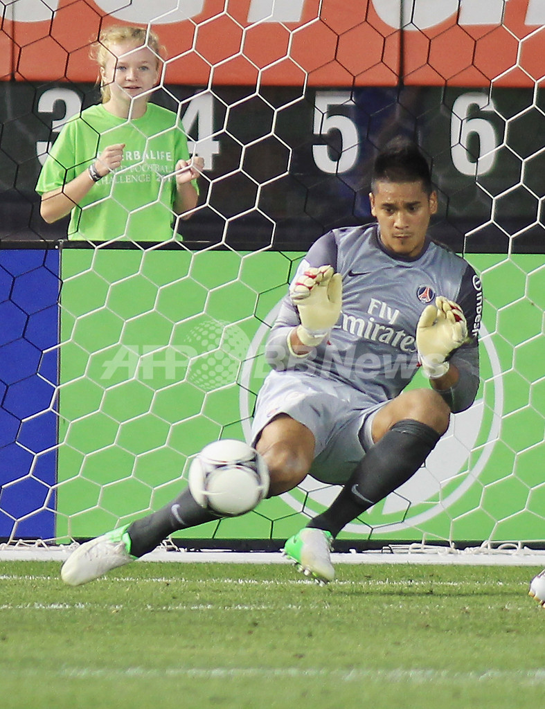 シュートをセーブするパリ・サンジェルマンのGKアルフォンス・アレオラ(Alphonse Areola、2012年7月22日撮影)。(c)AFP/Getty Images/Andy Marlin