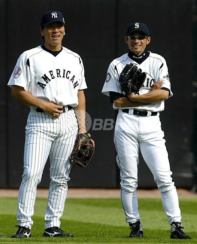 第74回MLBオールスターゲーム(74th All-Star Game)で練習中に松井秀喜(Hideki Matsui、左)と言葉を交わすイチロー(2003年7月14日撮影)。(c)AFP/Jeff HAYNES