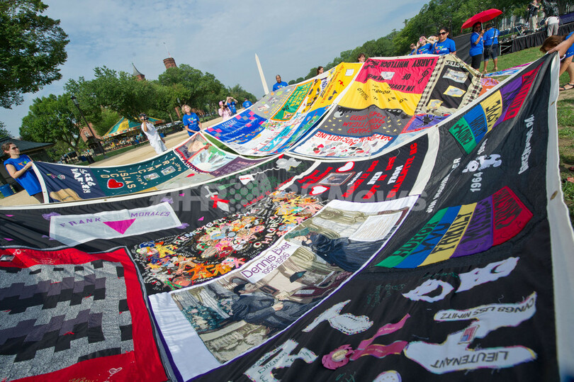 写真はナショナル・モール(National Mall)でエイズによる死者を追悼するキルトを敷くボランティアら(2012年7月23日撮影)。(c)AFP/Karen BLEIER