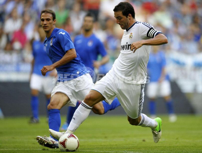 ドリブル突破を試みるレアル・マドリードのゴンサロ・イグアイン(Gonzalo Higuain、2012年7月24日撮影)。(c)AFP/MIGUEL RIOPA