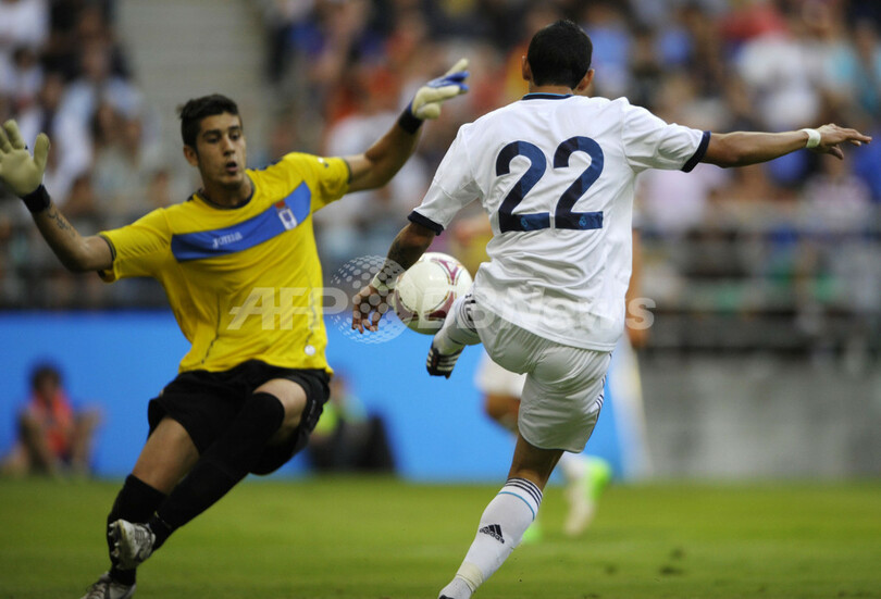 シュートを放つレアル・マドリードのアンヘル・ファビアン・ディ・マリア(Angel Fabian Di Maria、右、2012年7月24日撮影)。(c)AFP/MIGUEL RIOPA