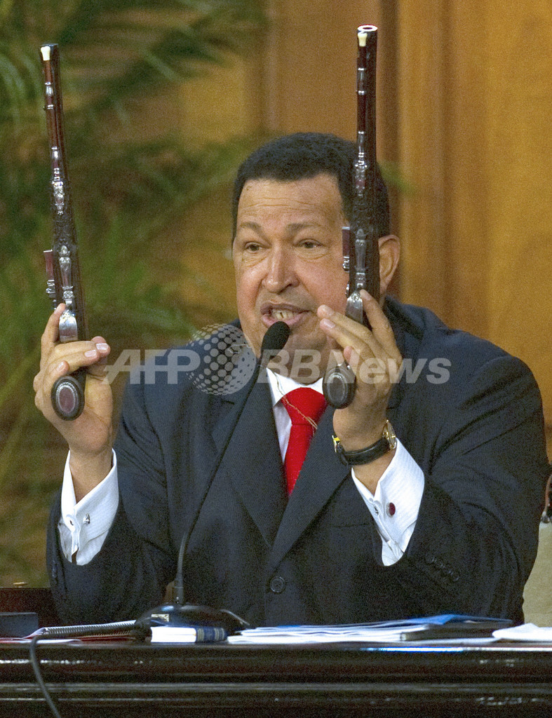 写真は首都カラカス(Caracas)で開かれた記念式典で、ボリバルが所有していた銃を公開するチャベス大統領(2012年7月24日撮影)。(c)AFP/JUAN BARRETO