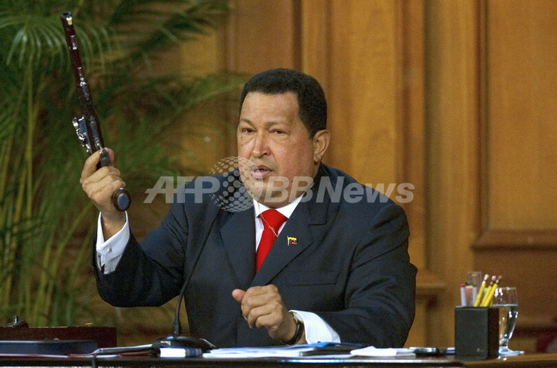 写真は首都カラカス(Caracas)で開かれた記念式典で、ボリバルが所有していた銃を公開するチャベス大統領(2012年7月24日撮影)。(c)AFP/JUAN BARRETO