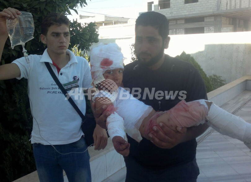 写真は、シリア反体制派の拠点となっている同国中部のホムス(Homs)県ホウラ(Houla)で救出される負傷した子ども(2012年7月13日撮影)。(c)AFP/HO/SHAAM NEWS NETWORK