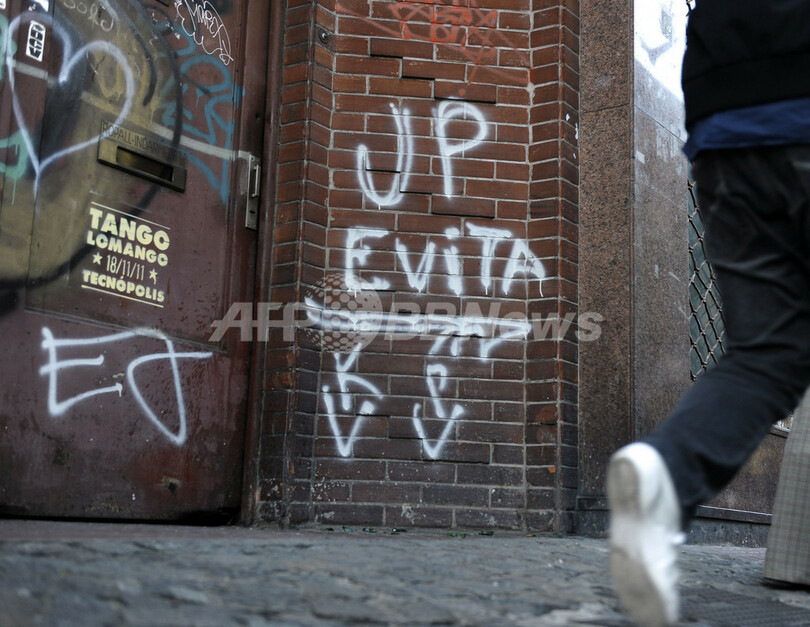 写真は、アルゼンチンの首都ブエノスアイレス(Buenos Aires)のサンテルモ(San Telmo)地区で、死後60年を経てもエビータへの支持を示す落書き。(2012年7月22日撮影)。(c)AFP/ALEJANDRO PAGNI