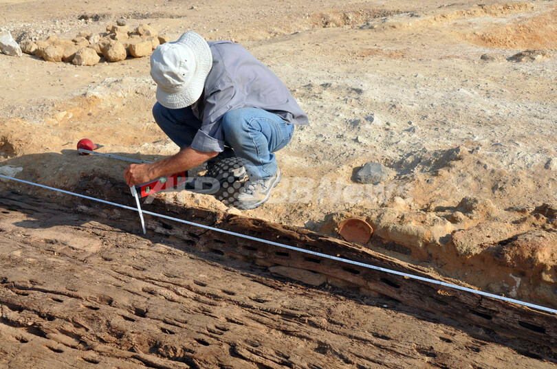 古代エジプトのファラオたちは、埋葬場所の近くに埋められた太陽の船が自分たちを死後の世界へと導いてくれると信じていた。今回見つかったのは全長6メートル、幅1.5メートルの木造船で、保存状態は良いという。修復作業の後、博物館に展示される予定だ。(c)AFP
