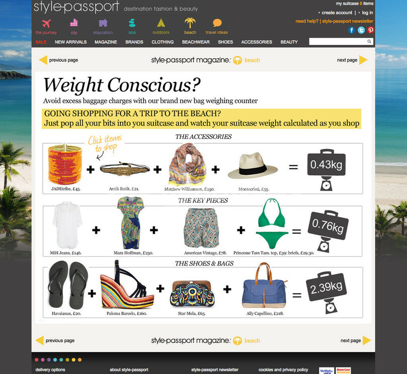 現在、英国旅行者のうち27%は、旅行の際手荷物が重量制限を超えてしまい、超過料金の20ポンド(約2420円)を支払っている。そこで「スタイル・パスポート」では、サイト上で販売する商品すべてに重量を記載。カートに入れた商品の総重量がチェックアウト画面で表示されるサービスをはじめた。アイテム総重量が、一般的な航空会社の重量制限を超えると警告がでる仕組みだ。