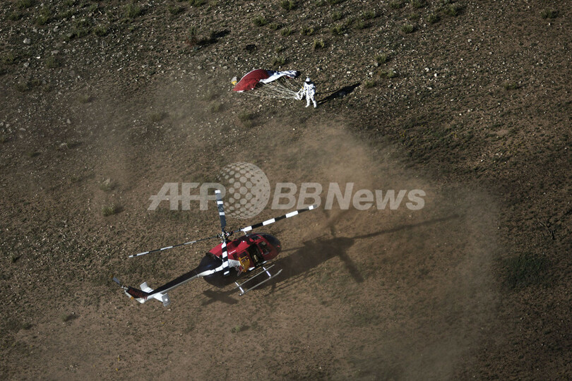 最終テストでは、高度2万9455メートルからのダイブに成功。気球に搭載したカプセルで目標高度まで到達後、バウムガルトナーさんはカプセルのドアを開け、飛び降りた。3分48秒間のフリーフォールで、最高速度は時速862キロに達した。(c)AFP