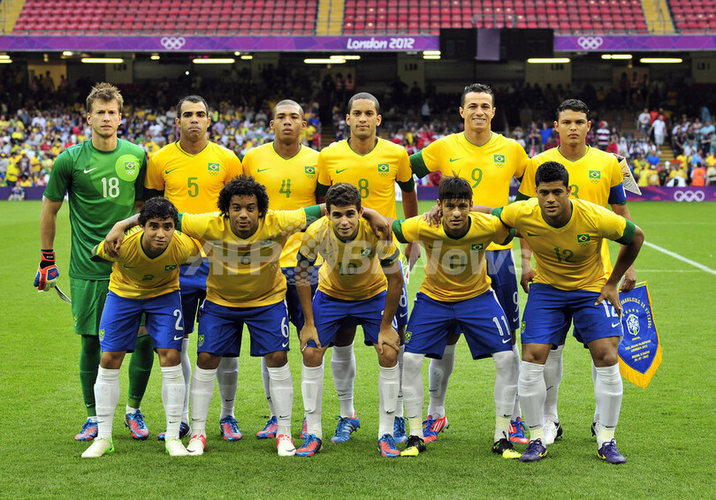 ロンドン五輪、男子サッカー1次リーグC組、ブラジル対エジプト。試合前の写真撮影に臨むブラジルの選手(2012年7月26日撮影)。(c)AFP/GLYN KIRK