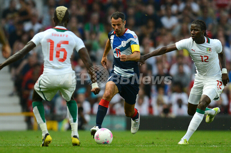 セネガルの選手に囲まれる英国のライアン・ギグス(Ryan Giggs、2012年7月26日撮影)。(c)AFP/ANDREW YATES
